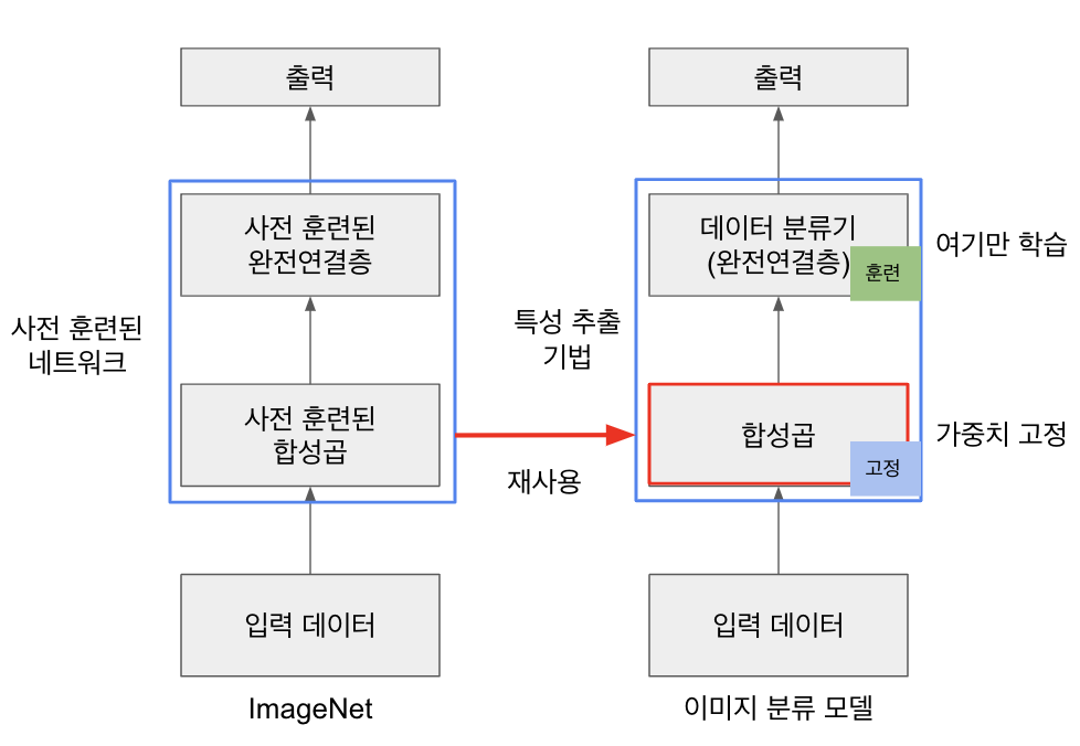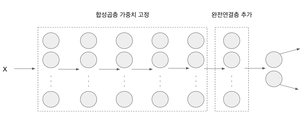 새로운 데이터셋에서 특성 추출을 위해서는, 먼저 사전 학습된 모델의 합성곱층을 고정(freeze)시키고, 완전 연결층 부분만 새로운 데이터셋에 맞게 변경하여 학습합니다.