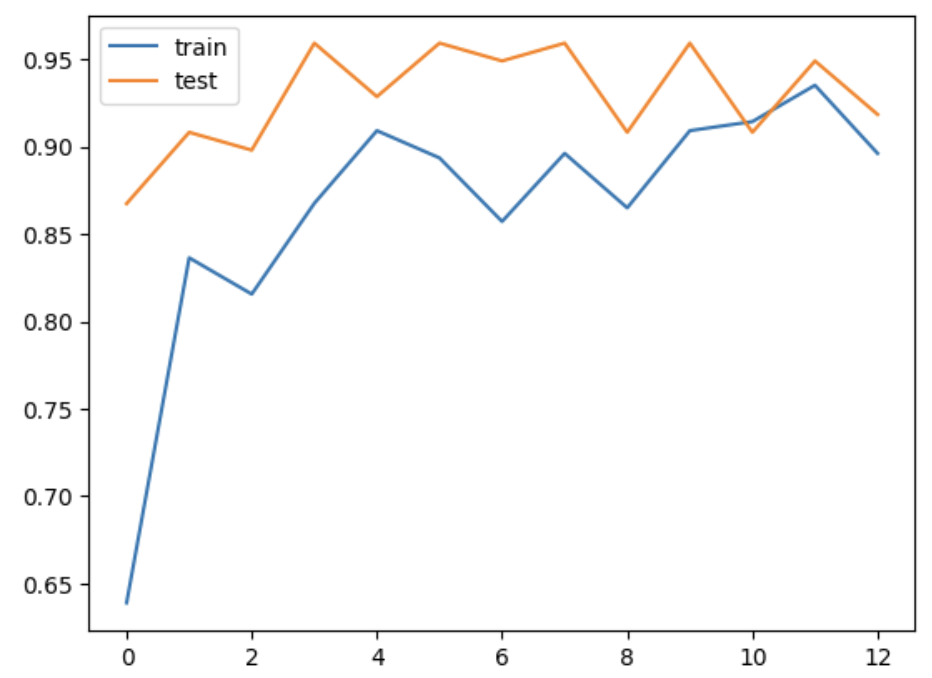 train와 test 데이터 모두 epoch가 진행될수록 정확도가 높아지고 있습니다.