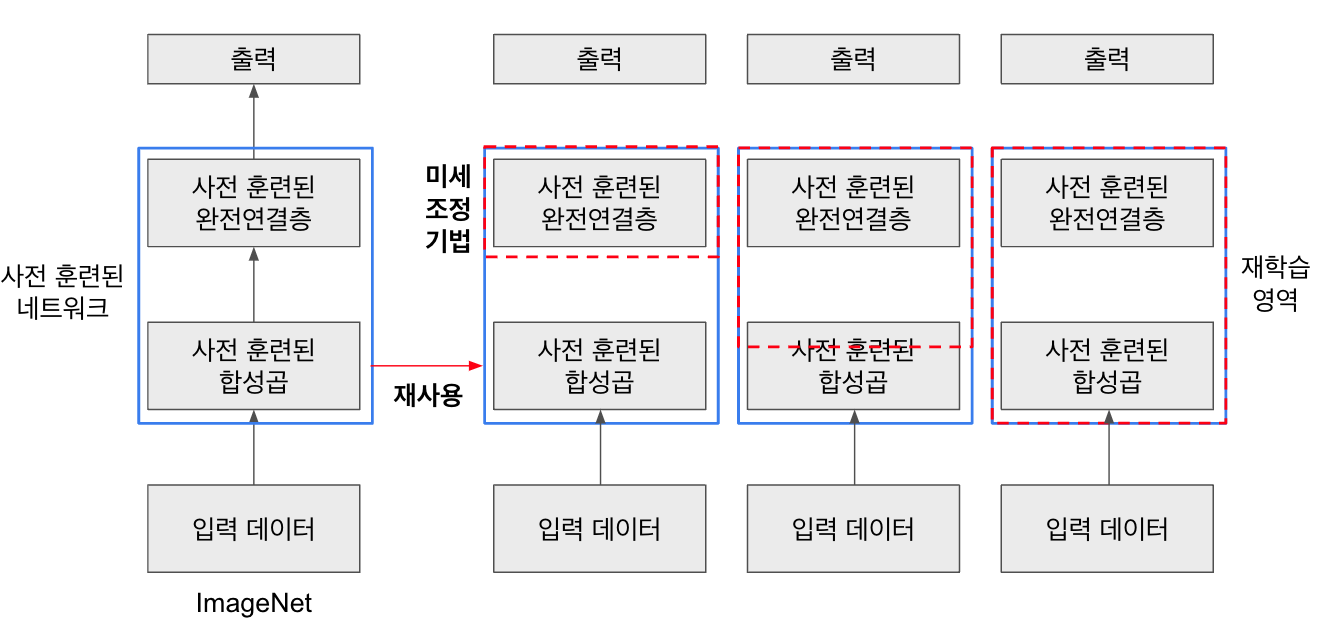 → 전체 모델을 처음부터 학습시키는 것보다 효율적 - 미세 조정기법(fine-tuning): 사전 학습된 모델의 일부를 재사용하여 새로운 모델을 구성하는 방법