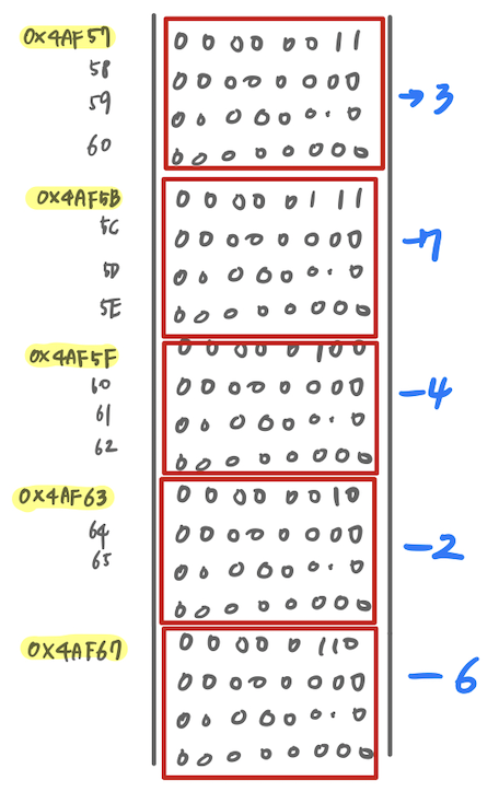 만약 첫 번째 데이터가 저장된 주소값이 (0x4AF57)라면 2번째 데이터는 (0x4AF57 + 4 * 1)에, 3번째 데이터는 (0x4AF57 + 4 * 2), n번째 데이터는 (0x4AF57 + 4 * n)에 저장되어 있다. 아무리 긴 배열이라고 한 번의 연산으로 원하는 데이터에 바로 접근이 가능하다. 즉 O(1)의 시간복잡도를 갖는다.