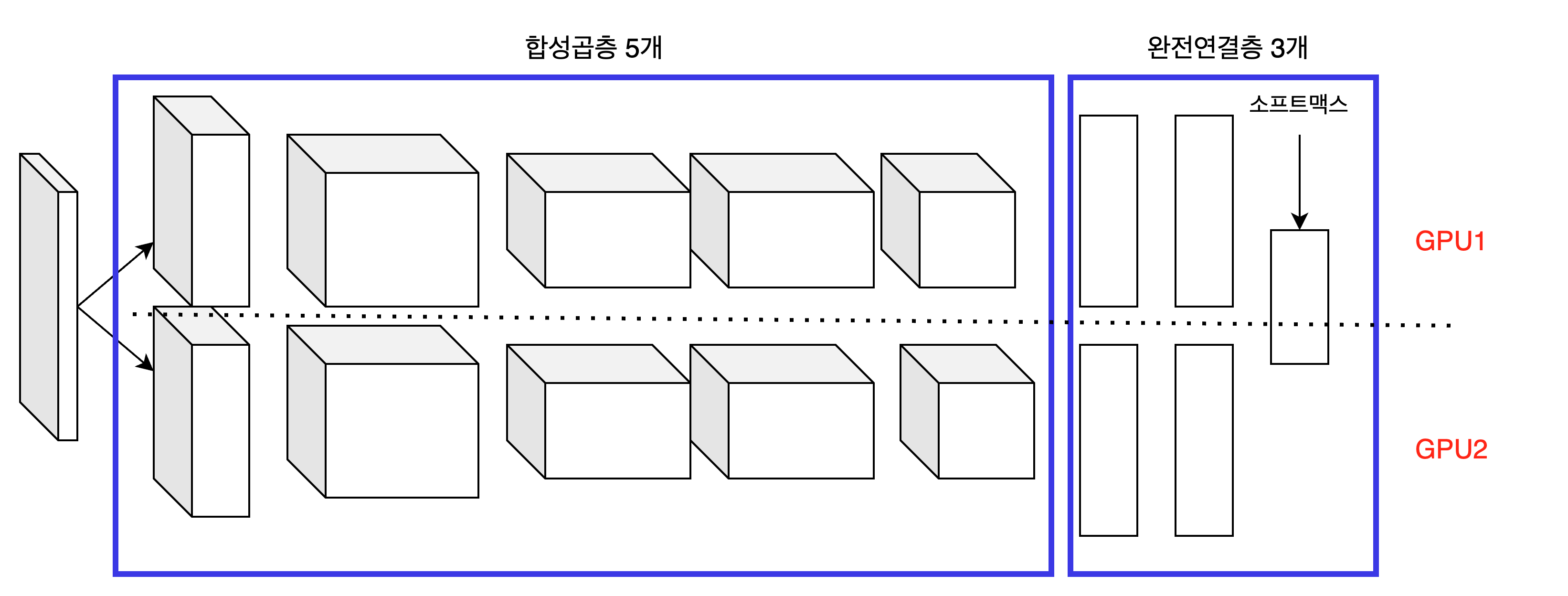 | 합성곱층 | 96 | 55X55 | 11X11 | 4 | 렐루(Relu) |