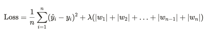 L1 규제는 모델의 손실 함수에 가중치의 절댓값의 합에 비례하는 항을 추가합니다. 수학적 표현은 다음과 같습니다.