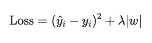 위 식에서 볼 수 있듯이, 가중치는 총 n개가 있습니다. 이 중 L1 규제의 특성으로 인해 일부 가중치를 0으로 만드는 특성이 바로 L1규제입니다. 예를 들어 총 10개의 가중치 중 8개의 가중치는 0에 아주 가까운 값이 되고 2개의 가중치는 0이 되어서 모델의 예측에 영향을 주지 않게 되는 거죠.