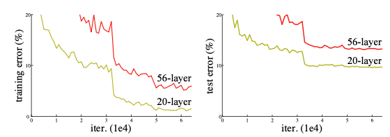 기존의 깊은 신경망에서는 네트워크의 레이어가 많아질수록 처음에는 정확도가 증가하는 것처럼 보이지만, 일정 수준 이상으로 레이어가 증가하면 갑자기 정확도가 떨어지는 문제가 발견되었습니다. 이 현상은 네트워크가 과적합(오버피팅)되어 발생하는 것이 아니라, 단순히 레이어를 많이 추가할수록 학습이 잘 이루어지지 않고, 오히려 훈련 오류가 증가한다고 보고되었습니다.