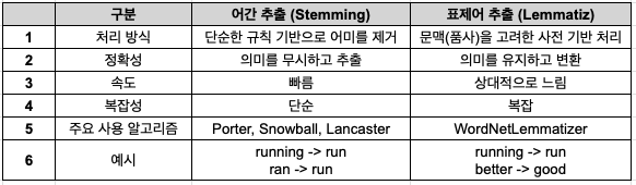 하지만 어간 추출과 표제어 추출은 각기 다른 방법론과 목적을 가지고 있습니다.