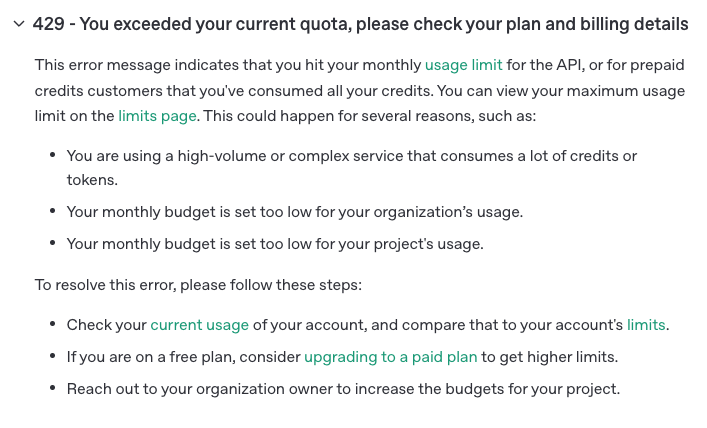 > “You exceeded your current quota, please check your plan and billing details. For more information on this error, read the docs: https://platform.openai.com/docs/guides/error-codes/api-errors.”