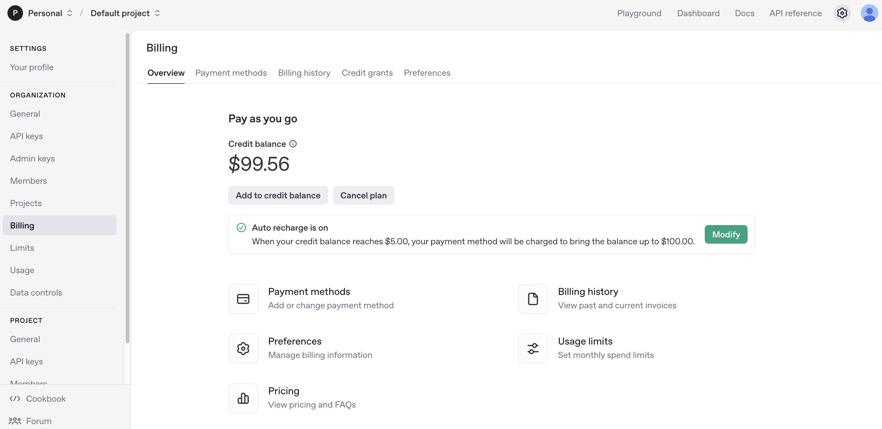 - Billing → Overview → Auto-recharge가 On 상태인지 확인