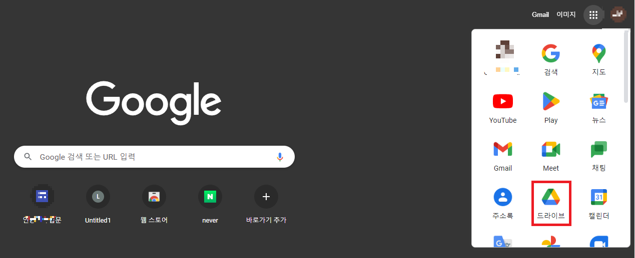오른쪽 상단에 점 9개 있는 아이콘을 누른 후 -> "드라이브"를 클릭해줍니다.