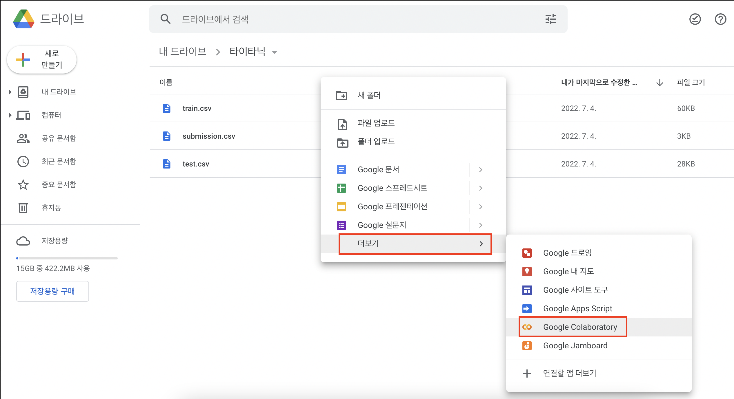 타이타닉 폴더에서 오른쪽 마우스 - 더보기 - Google Colaboratory 클릭