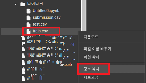 train.csv 오른쪽에 있는 점 세 개를 눌러서 경로 복사 클릭