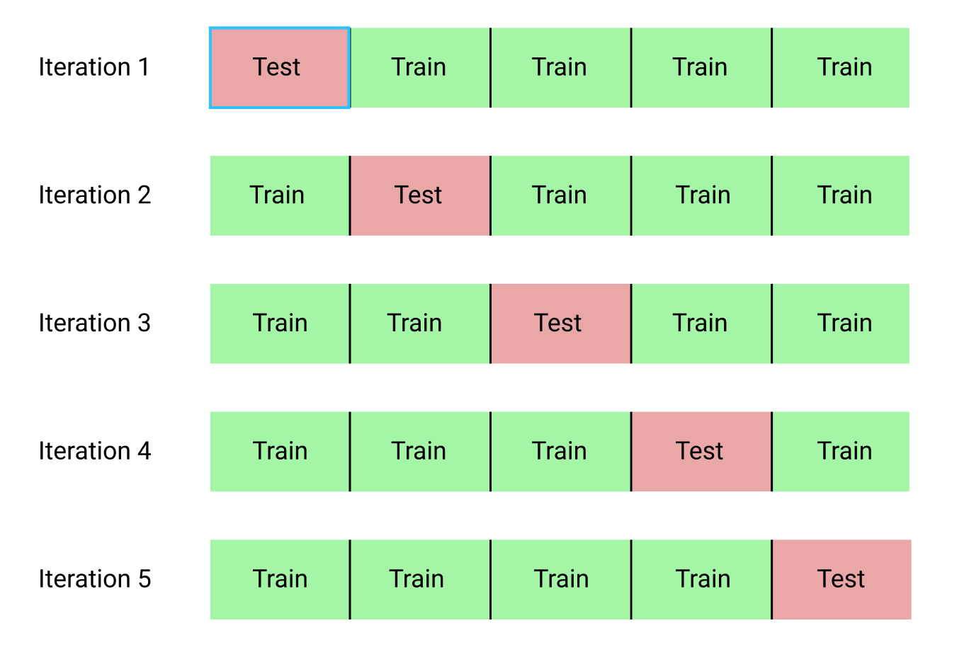 -전체 데이터 셋을 K등분 부분집합으로 나누고, k-1개 부분집합은 훈련데이터셋, 1개 부분집합은 데이터 셋으로 할당한다.