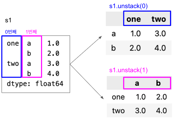 - 데이터프레임.unstack(몇 번째 인덱스? (default = 마지막인덱스))