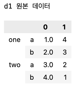 이번엔 [('one', 'a'), ('one', 'b'), ('two', 'a'), ('two', 'b')] 멀티인덱스이면서 0, 1의 칼럼을 갖는 d1 데이터프레임을 생성해 보았습니다.