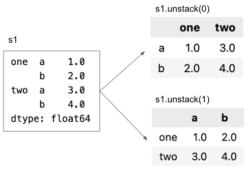 unstack(level = 1)은 1번째 인덱스 값인 a, b 가 columns 부분으로 옮겨졌습니다.