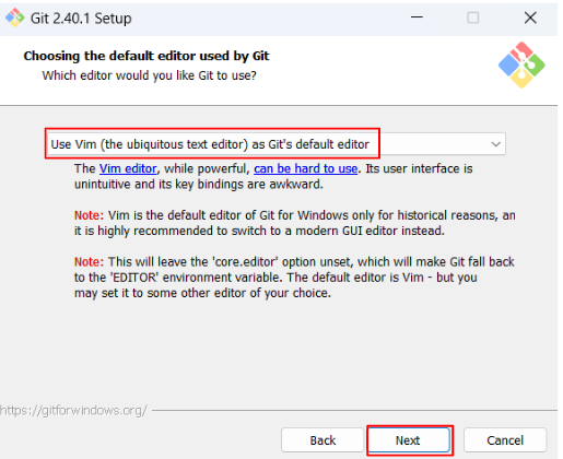 Git이 기본적으로 사용할 텍스트 편집기(Text Editor)를 선택하는 옵션입니다. Git에서는 커밋 메시지를 작성하는 등의 작업에서 텍스트 편집기를 사용합니다.