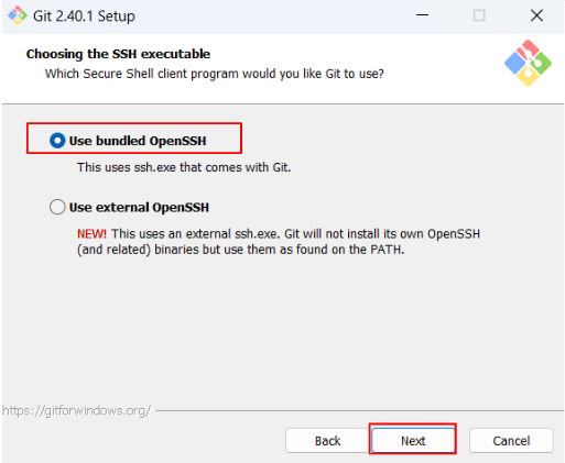 이 옵션에서는 Git이 SSH 연결을 수행할 때 사용할 SSH 실행 파일의 경로를 지정할 수 있습니다. 대부분의 경우, 기본 설정인 "Use OpenSSH"를 선택하는 것이 좋습니다.